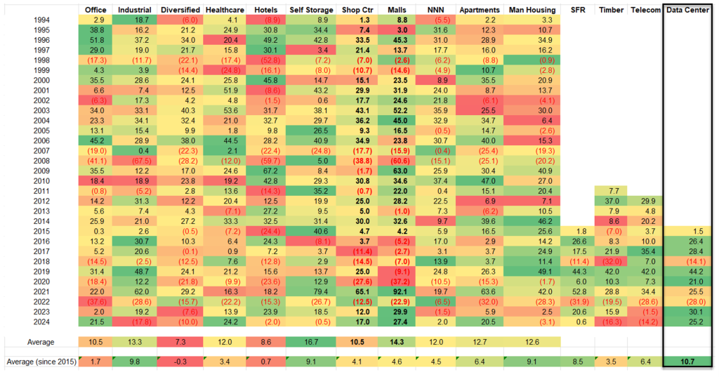 Altogether, data-center REITs have generated an average annual return of 10.7% from 2015 to 2024. That makes them the top-performing REIT sector during this period.