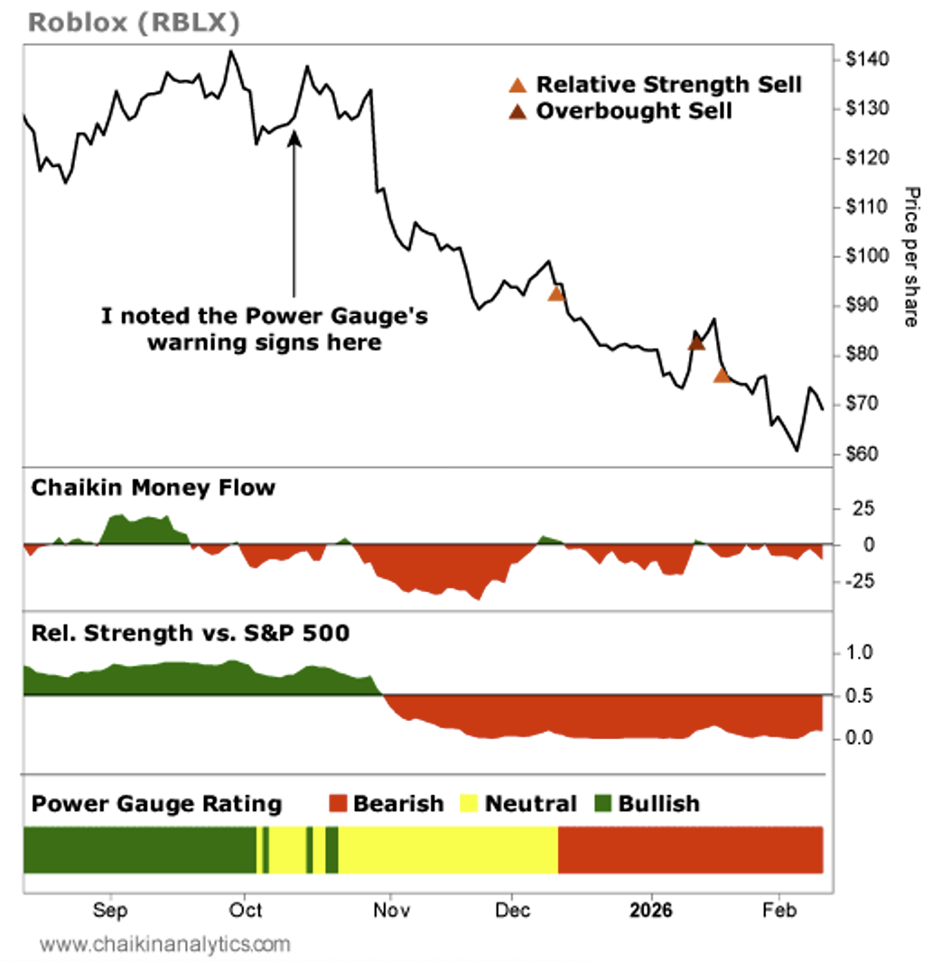 As Roblox continued to fall, the Power Gauge flashed sell alerts for the stock. The first one came on December 10, 2025. That’s right around when Roblox fell into “bearish” territory in our system.