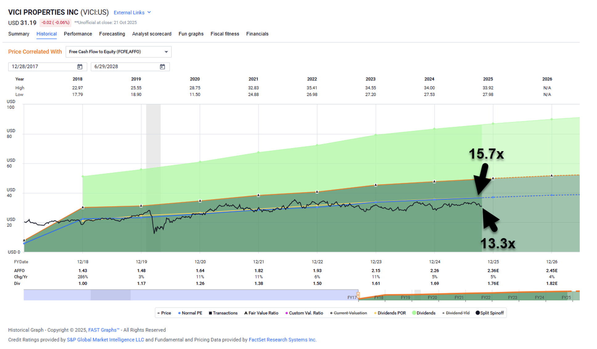 Currently, its dividend yield is 5.8% and shares are undervalued, as shown below. VICI’s current multiple is 13.3 times versus its normal 15.7 times.