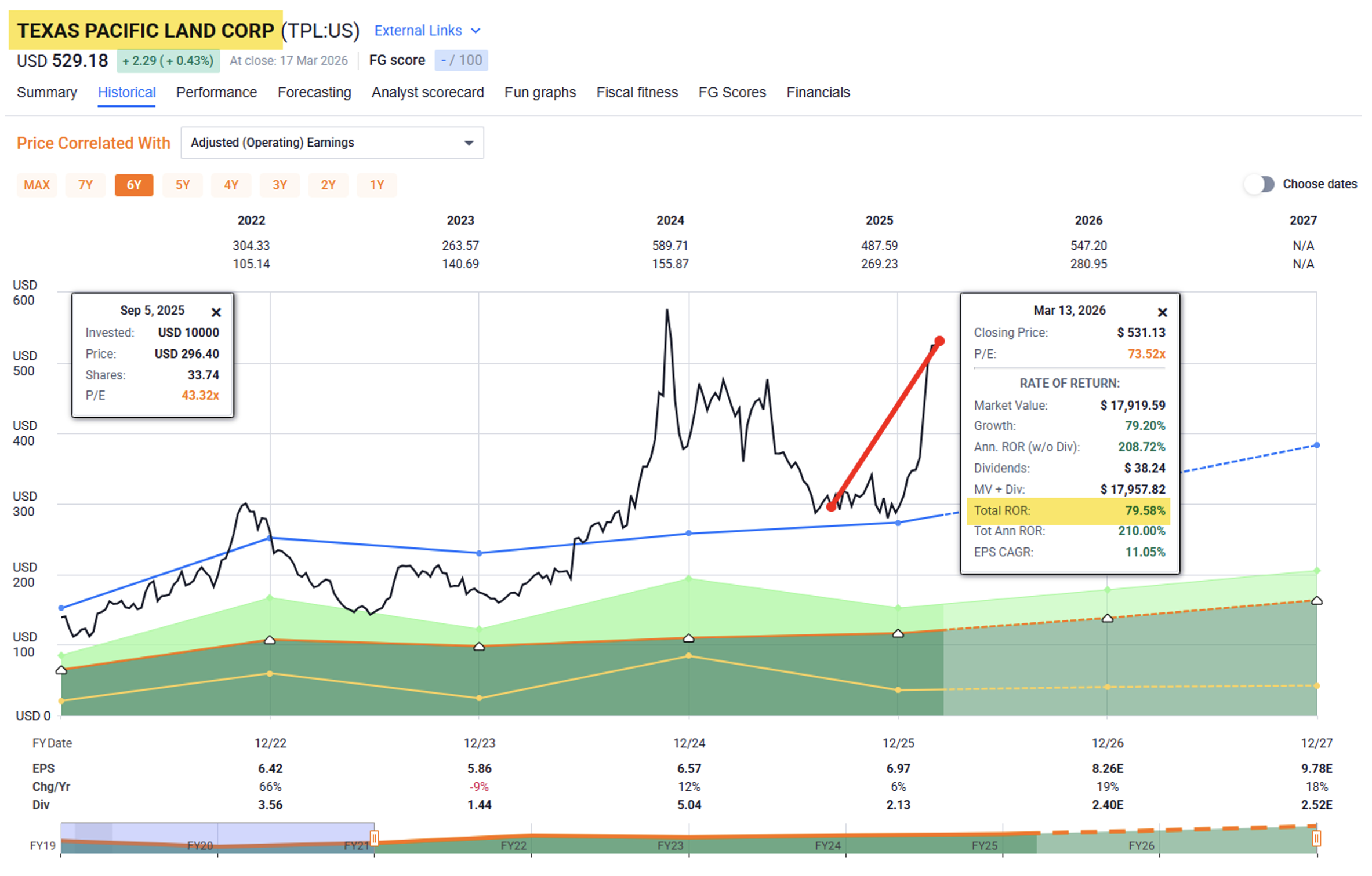 Let’s look at Texas Pacific Land (TPL), one of the largest private landowners in Texas. It’s a fascinating hybrid of energy royalty trust and real estate operating company that captured my attention last year.