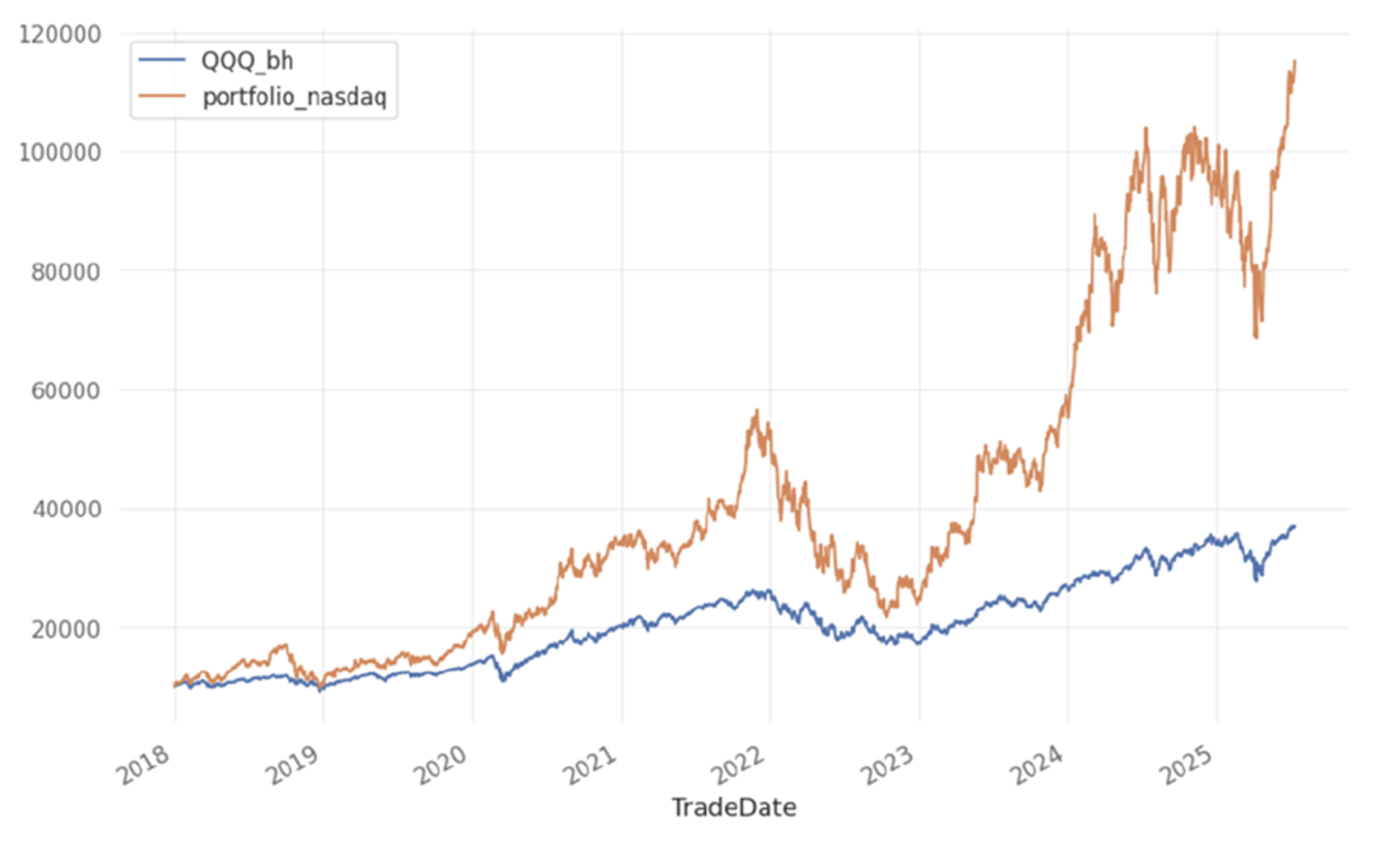 The blue line shows $10,000 invested in QQQ since January 2018. The orange line shows $10,000 put into the top five QQQ stocks selected by our MVO model on the same date.