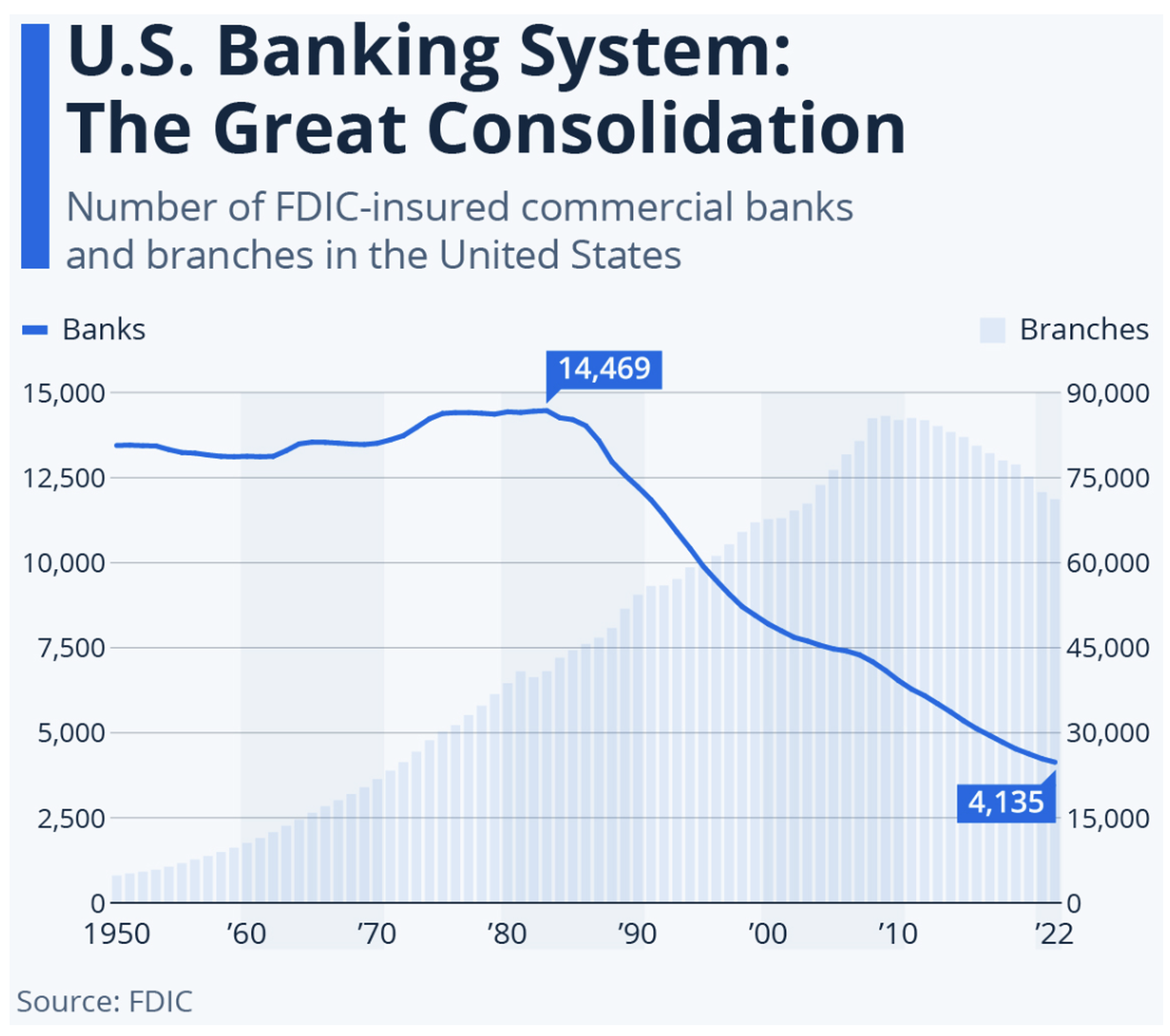 The banking crises of the 1980s, 1990s, and eventually 2008/2009 put downward pressure on the number of banks in the U.S. Increased regulatory and compliance costs also encouraged bank mergers.