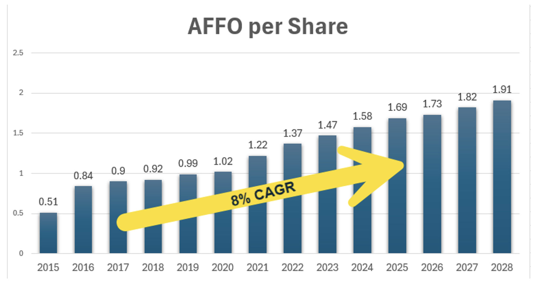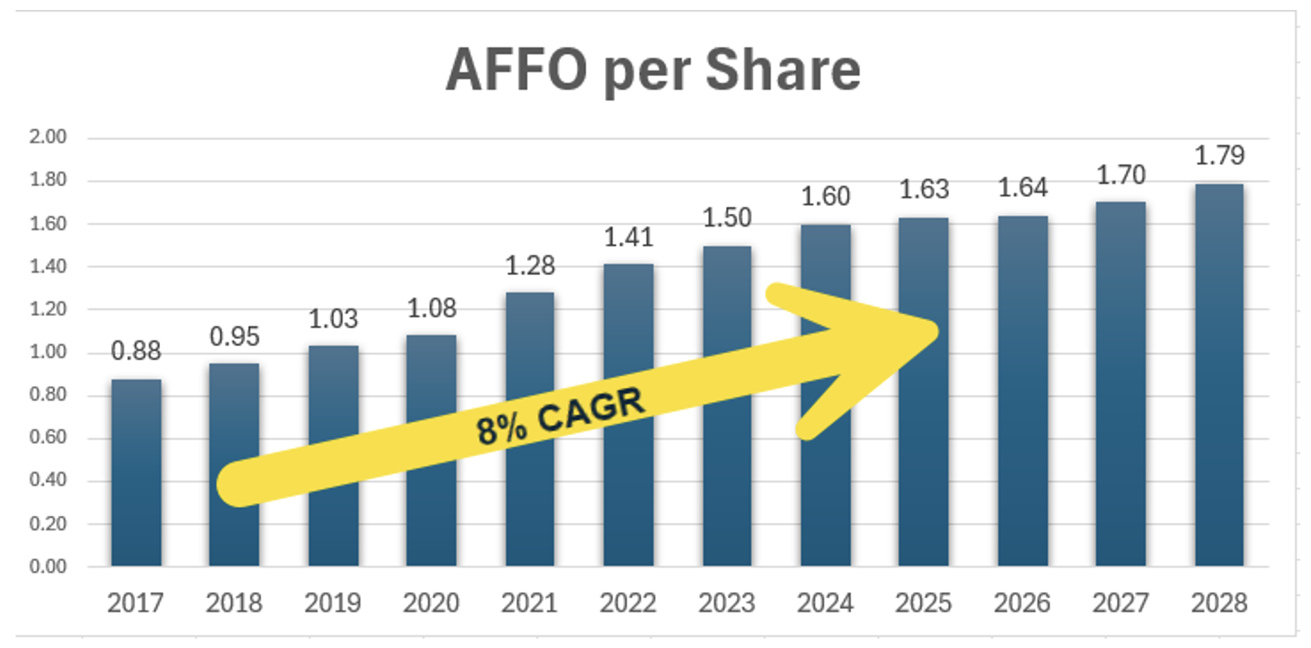The REIT generated 8% earnings (AFFO per share) growth from 2017 to 2025, while its dividend averaged around a 25% compound annual growth rate (“CAGR”).