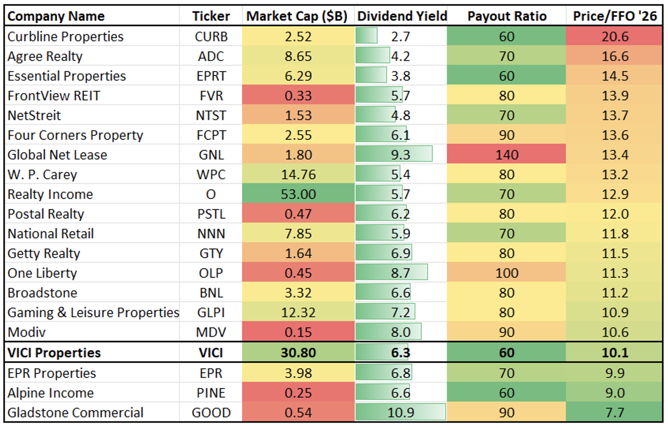 As seen below, VICI is trading at an attractive valuation of 10.1 times with a 6.3% dividend yield. Shares have returned around 7% year to date, 60% less than its largest peer, Realty Income (O) – which I wrote about on Monday.