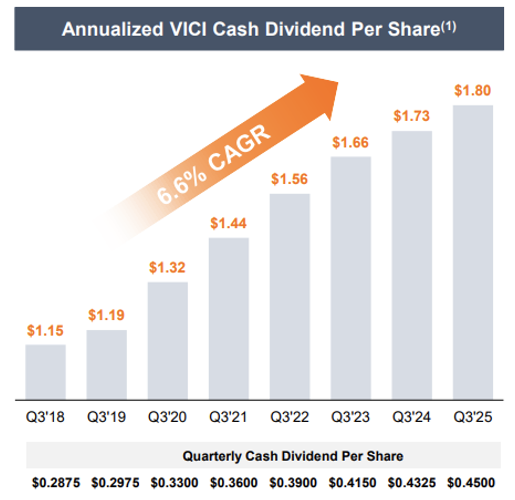 Its balance sheet, for one thing, is in great shape. At the end of the third quarter of 2025, VICI had total debt of $17.1 billion and 5 times net debt to annualized adjusted EBITDA. The capital markets discipline it maintains has allowed it to generate steady and reliable dividends for its investors.
