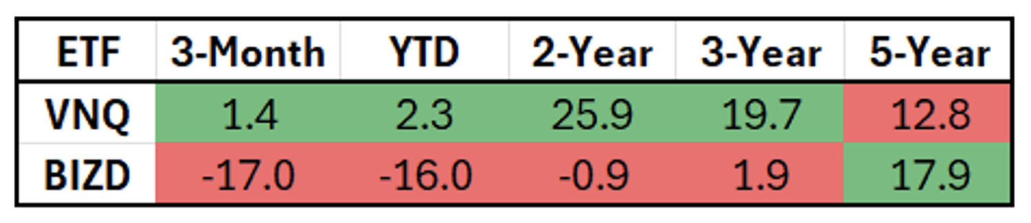 In terms of overall performance, consider Vanguard Real Estate Index Fund ETF (VNQ) and VanEck BDC Income ETF (BIZD).