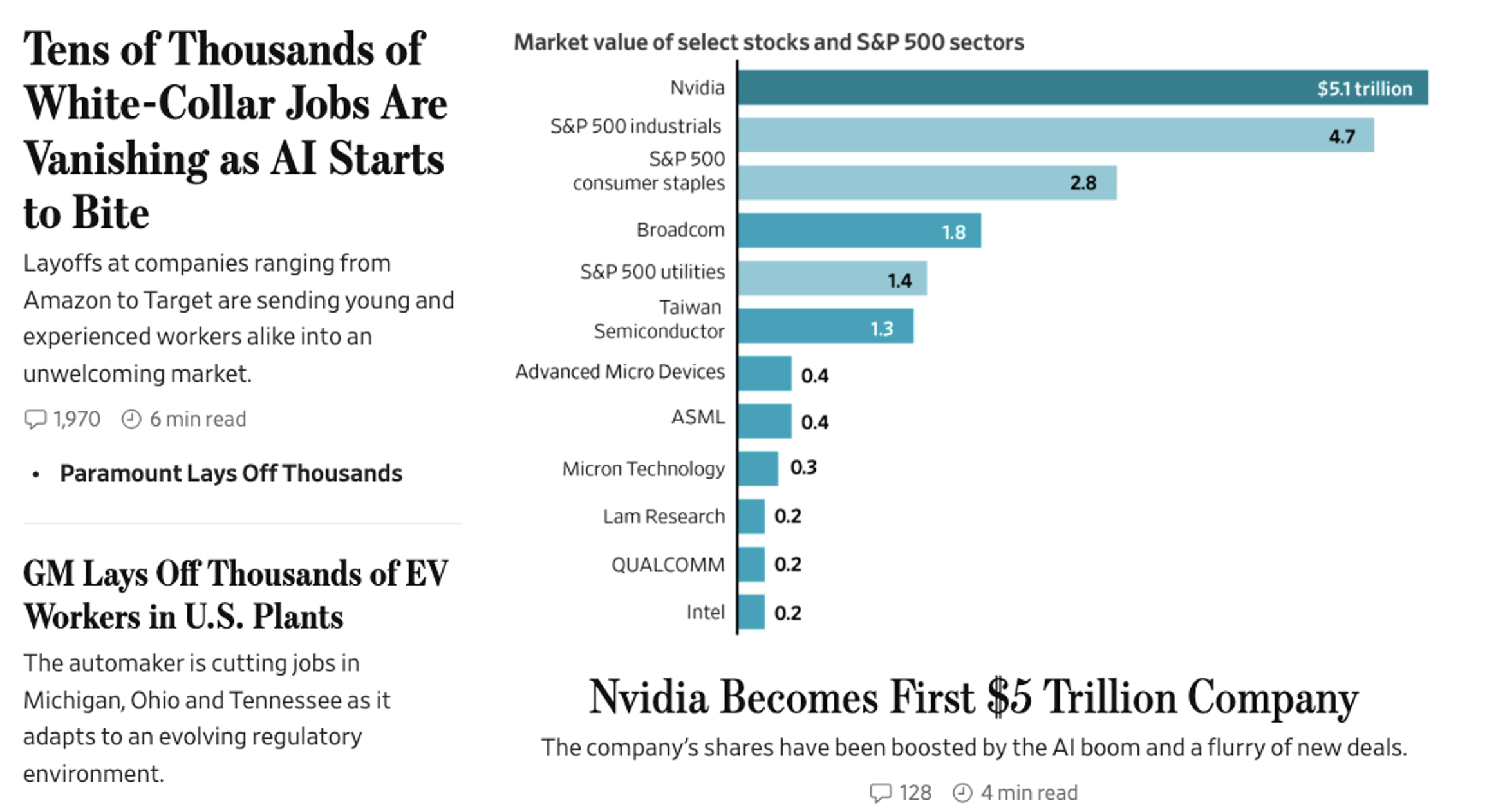 That’s a picture of the homepage of The Wall Street Journal yesterday afternoon. On the right, WSJ dutifully tells us that Nvidia (NVDA) just surged past a $5 trillion market capitalization, the first public company to do so. Other AI-related stocks like Broadcom (AVGO), Advanced Micro Devices (AMD), and Micron Technology (MU) have also powered higher in recent months.