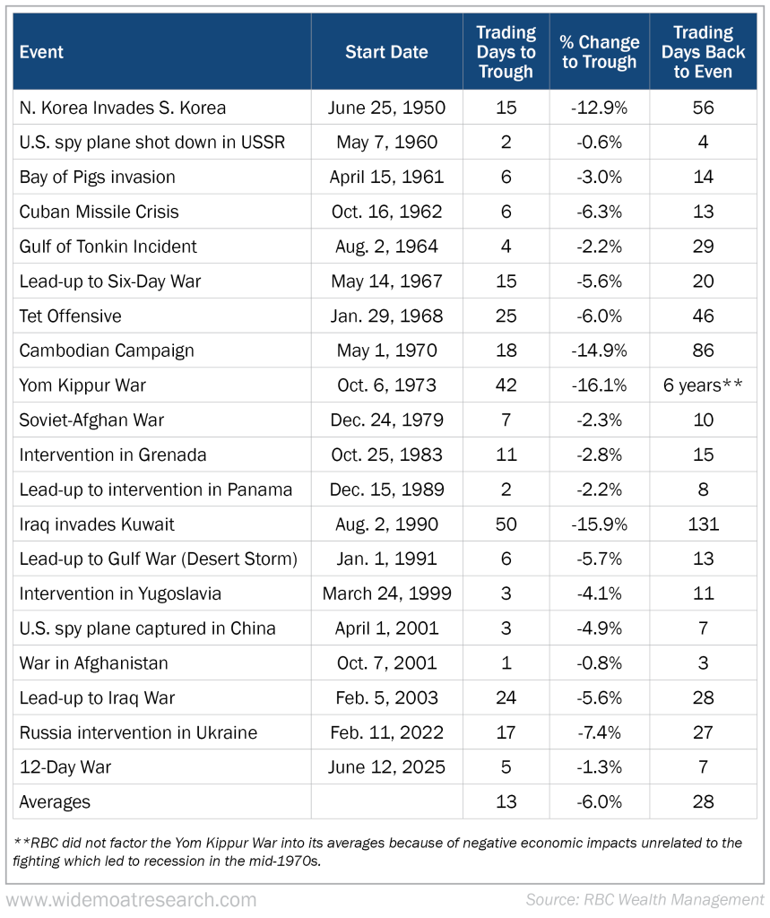 And so, I dug into how the stock market performed during past conflicts. Here’s what I found…
