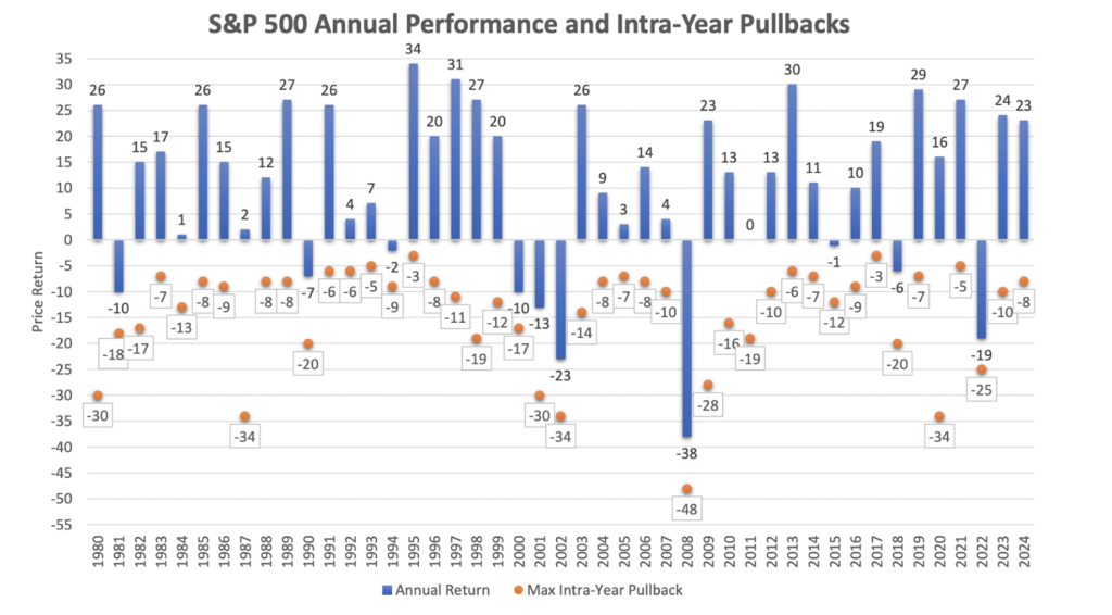 Here’s a chart from Raymond James. It shows the average annual intra-year pullback in the S&P 500 since 1980 has been roughly 14%. And yet, as you can see, during the vast majority of these years, the broad market’s performance was still positive (often, posting double-digit growth), in spite of these short-term dips.