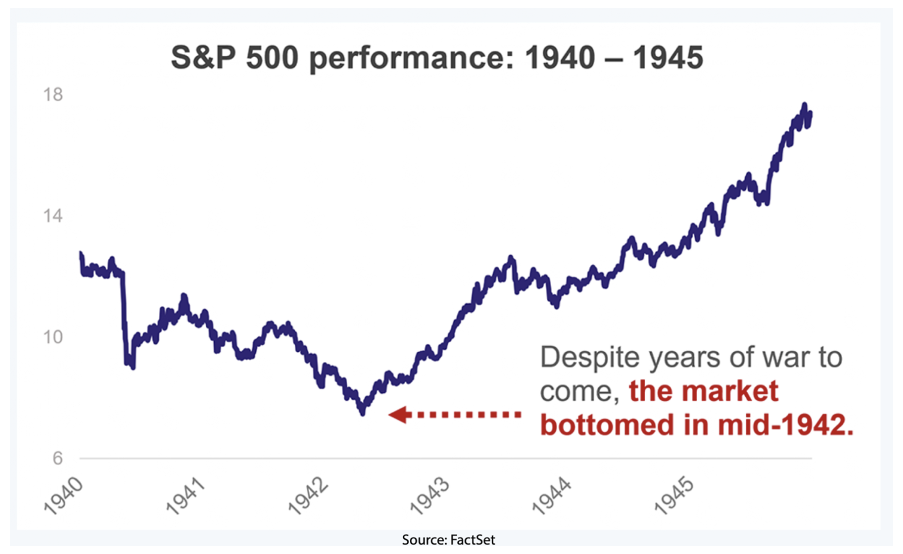 So, when preparing for this essay, I looked back at how the S&P 500 performed during the most apt comparison to that terrible scenario: World War II.