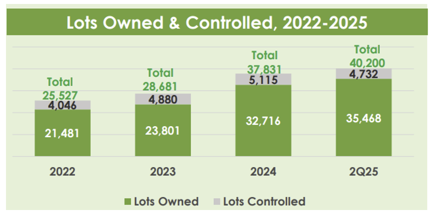 At the end of the second quarter of 2025, Green Brick grew its total lots owned and controlled by 21% year over year to 40,200. It owned over 35,000 of those on its balance sheet, with approximately 5,000 controlled.