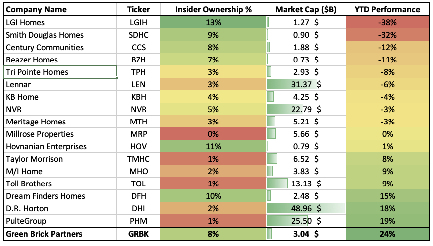 When I initiated research on Green Brick early this year, shares were trading at 7.4 times earnings, which was below the sector average of 8.3 times. Today, they’re at 10.7 times and have outperformed all their homebuilder peers year to date, up 24% (or 36% annualized).