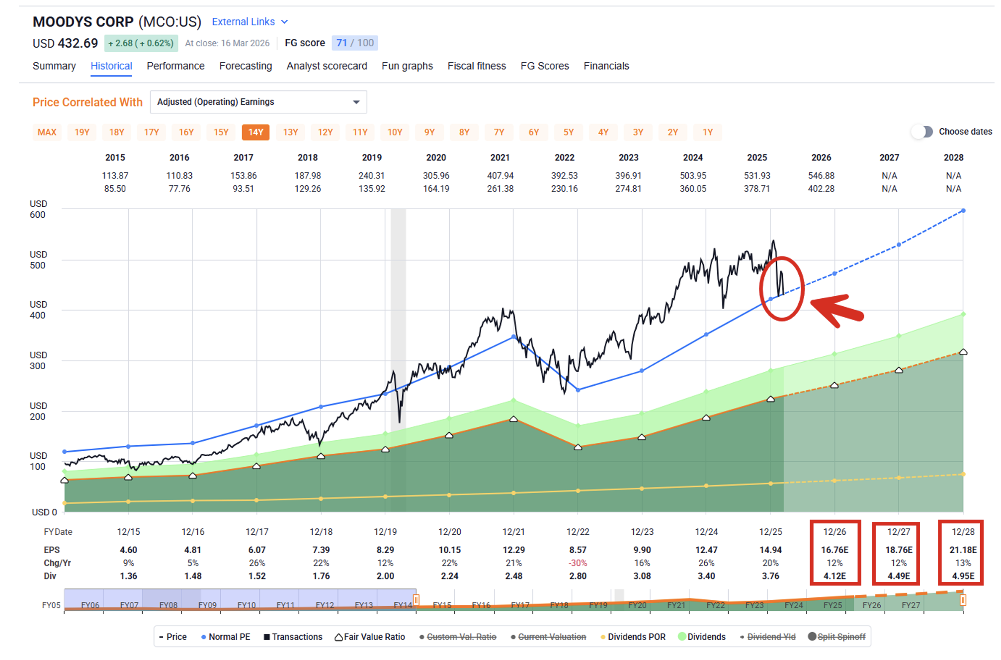 As you can see, Moody’s is now trading at fair value with a price of $432.69 and a price-to-earnings (P/E) multiple of 28.3 times. Its dividend yield is just around 1%, so hardly the most impressive percentage ever. However, analysts expect growth of 12% in 2026, 2027, and 2028.