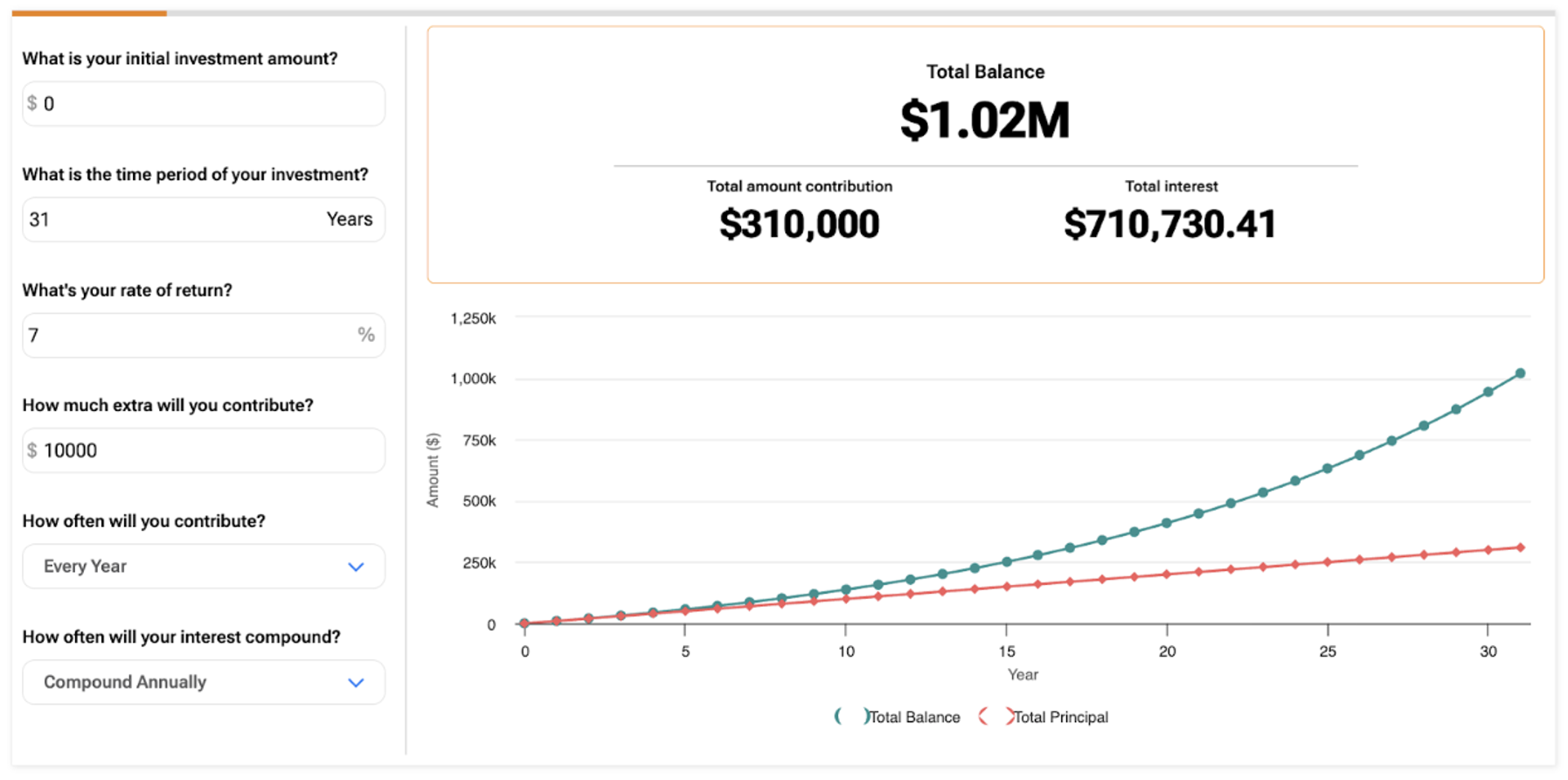 At a certain point, you could never save another penny, and you’d still reach your retirement target, all because of the organic compound interest taking place within your portfolio.