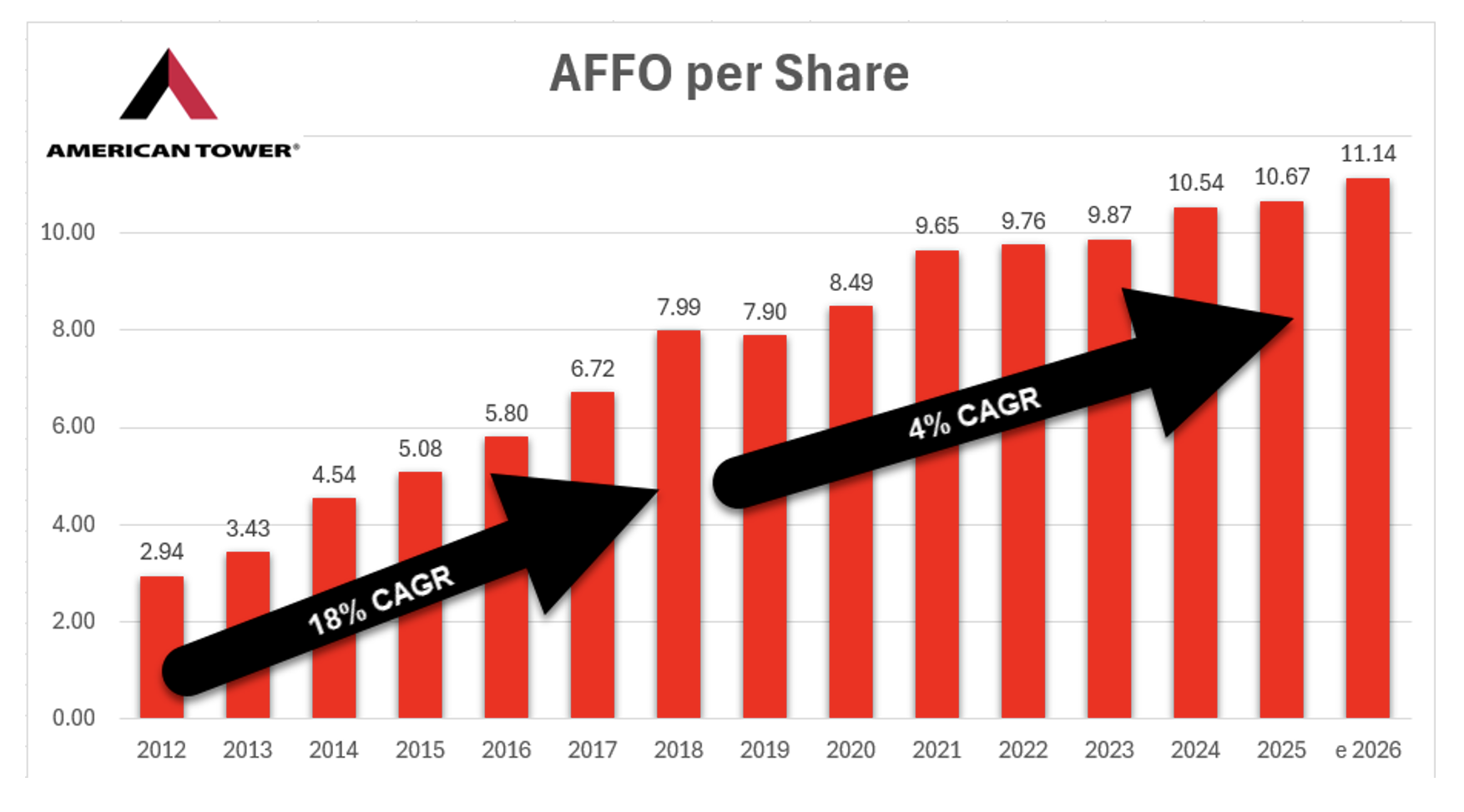 But that growth began to slow from there. American Tower’s adjusted funds from operations (“AFFO”), the REIT equivalent of earnings, grew by just 4% CAGR from 2018 to 2025, despite its best efforts.