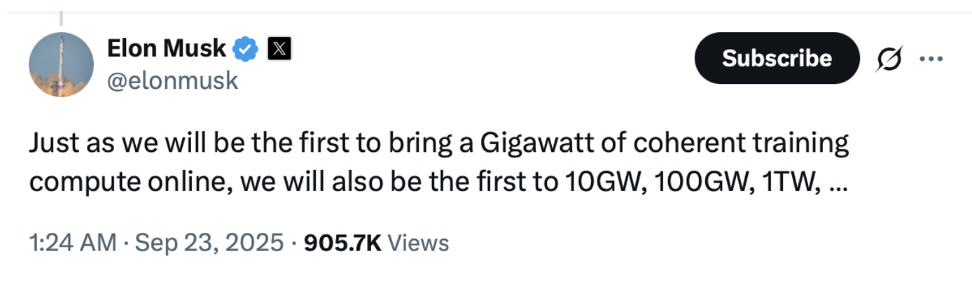 Musk, and his team at xAI, will be the first to 10 GW of compute, the first to 100 GW of compute, and yes, even a terawatt (“TW”) of compute.