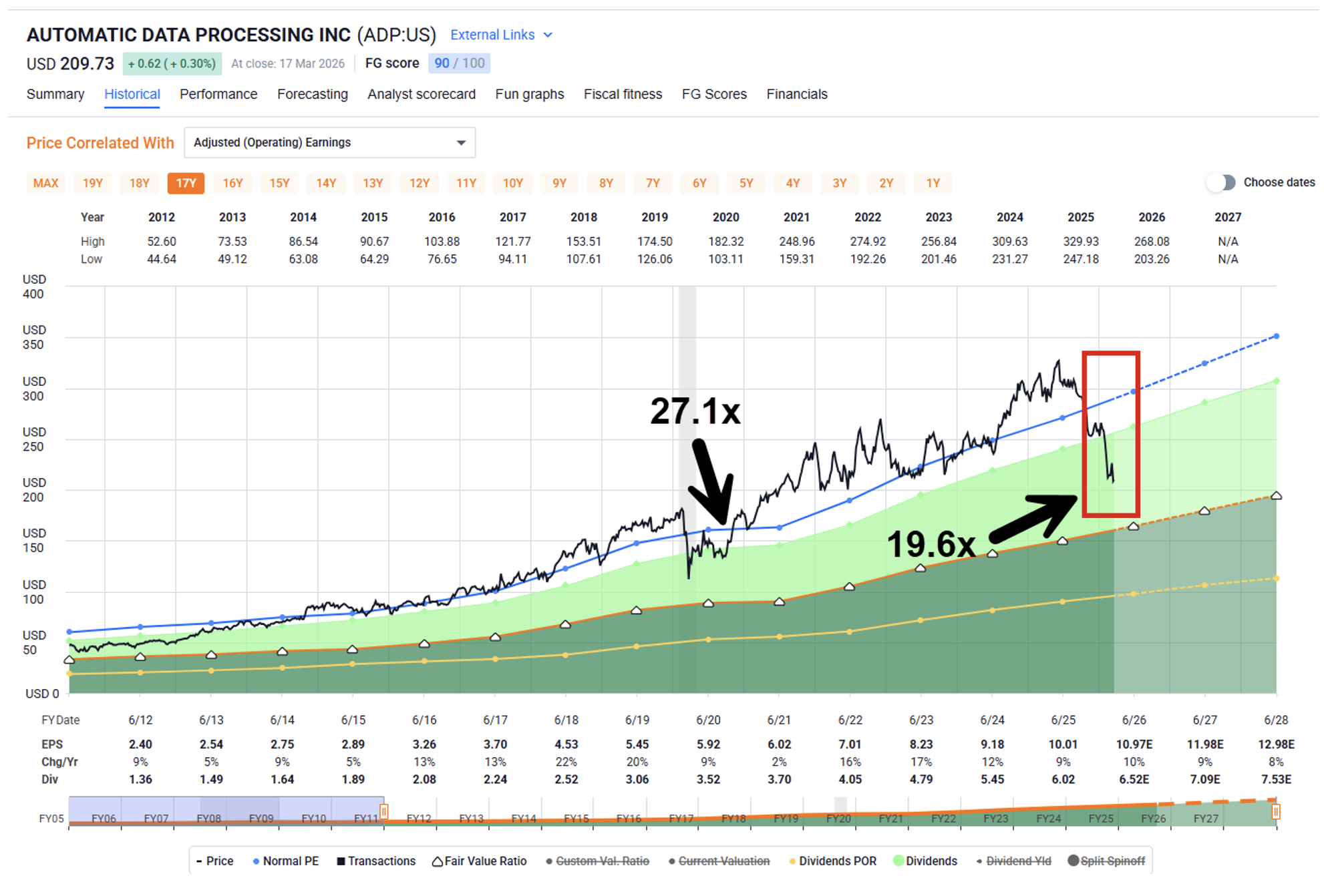 Yet shares have become deeply discounted, trading at 19.6 times as opposed to their normal multiple of 27.1 times, as shown below.