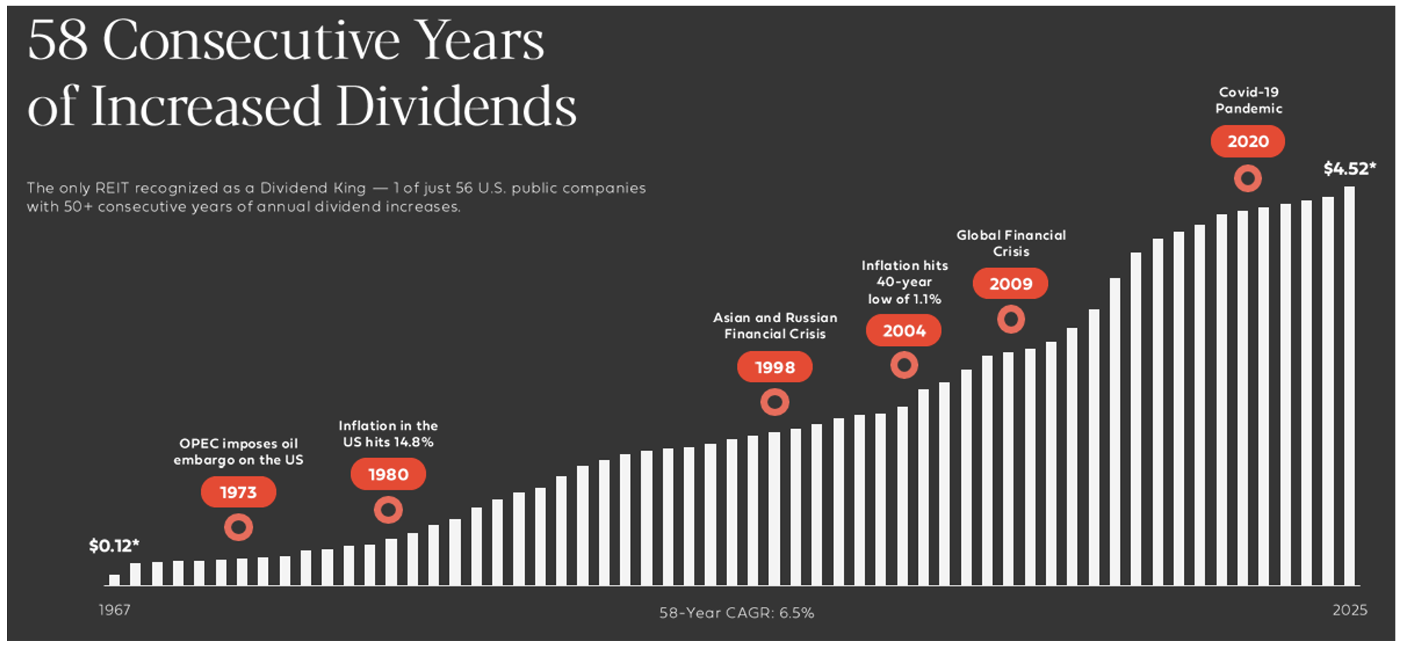 This Dividend King also generated funds from operations (“FFO”) per share of $1.84, representing 6.4% growth over the fourth quarter of 2024. And it gave guidance for core FFO per share of $7.42 to $7.52, about 5.8% growth compared with 2025.