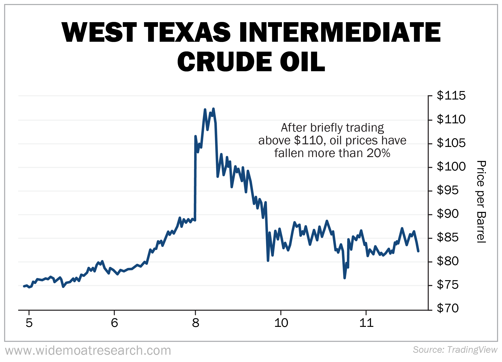 But now, at approximately $84 as I write, the light sweet crude is 25% off those highs… technically a bear market.
