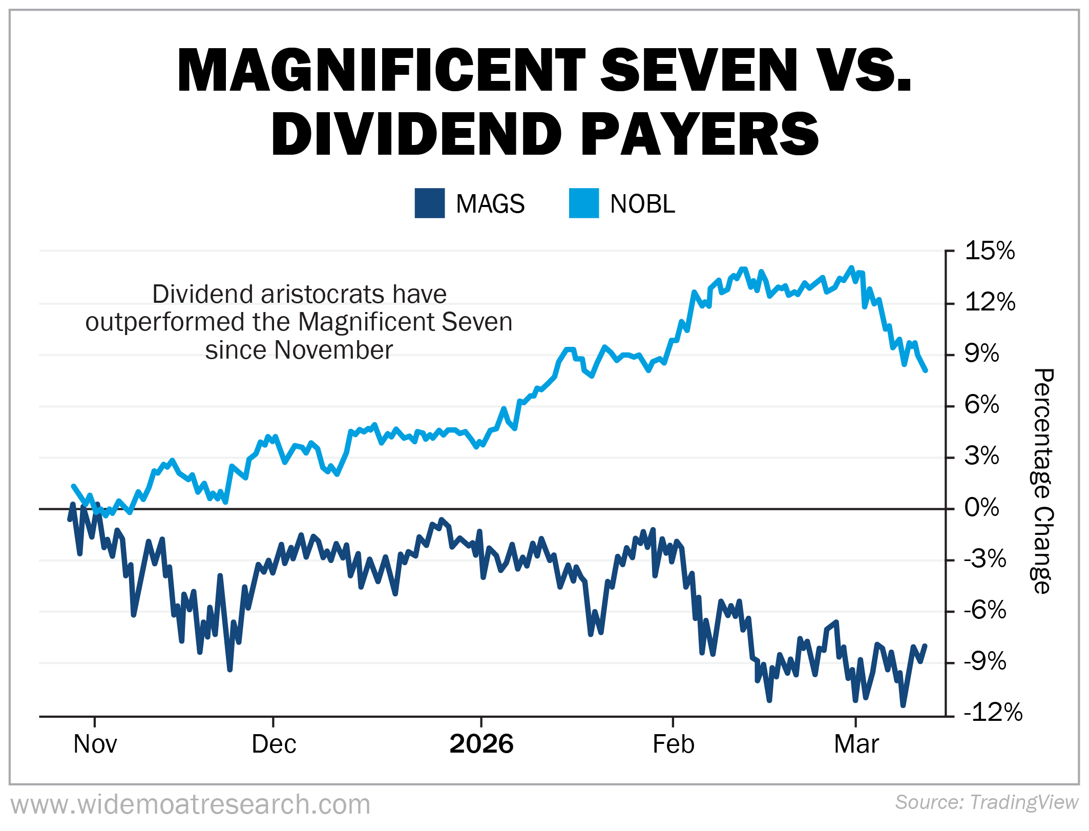 What you’re looking at is the Magnificent Seven – as measured by the Roundhill Magnificent Seven Fund (MAGS) – versus the ProShares S&P 500 Dividend Aristocrats Fund (NOBL).