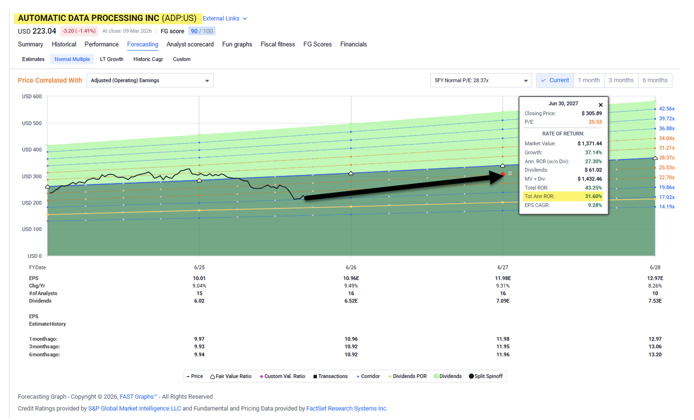 However, AI fears have investors doubting ADP’s longevity. As you can see below, shares are trading at a wide margin of safety with a 20.9 times multiple compared with its normal 25.5 times.