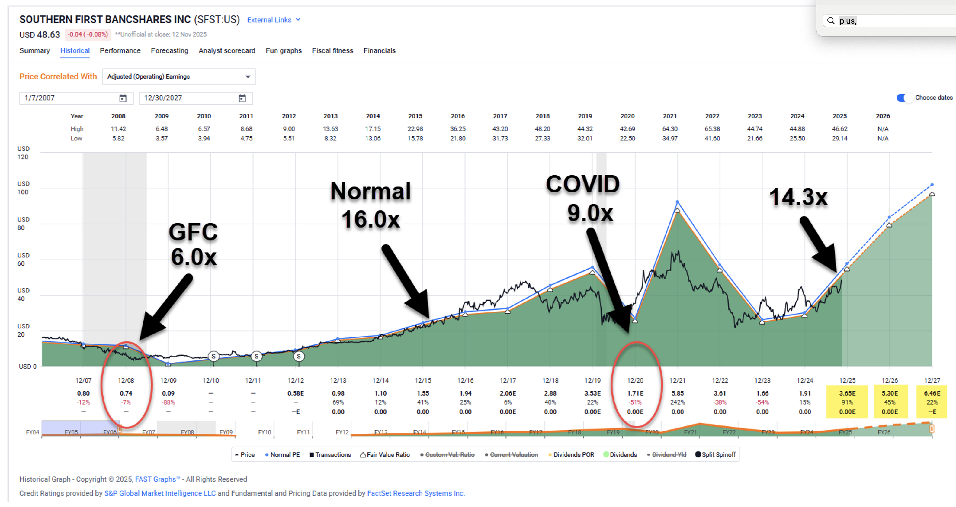 In short, fundamentals are rock solid. And in terms of valuation, Southern First is screaming, “Buy me!”