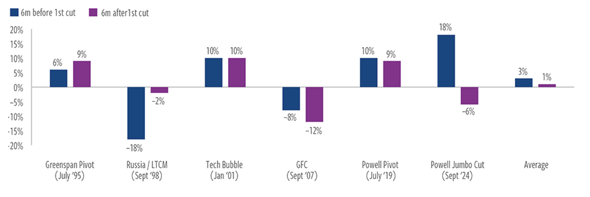 “While every cycle brings with it idiosyncrasies,” it notes, “an examination of past Fed rate-cutting periods indicates REITs have performed well when the Fed starts easing. And given the Fed’s efforts to telegraph policy changes, it is not surprising to see REIT performance in the six months prior respond positively in most instances.”