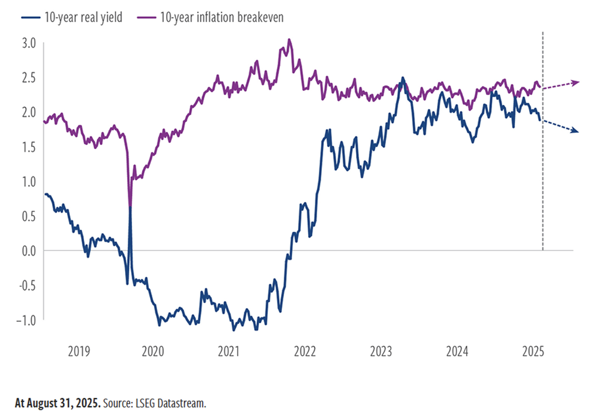 We’re now seeing a reversal of those trends, however. Real yields have fallen to 1.7%, which is 70 basis points (bps) below their 2023 peak, while inflation breakevens are trending higher.