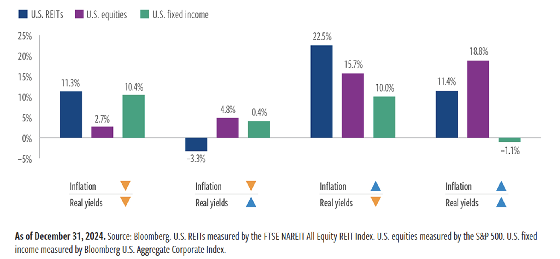 In the past, it was the combination of rising real rates and flat or falling inflation that has really presented a problem for commercial real estate values. Therefore, Cohen & Steers continues:
