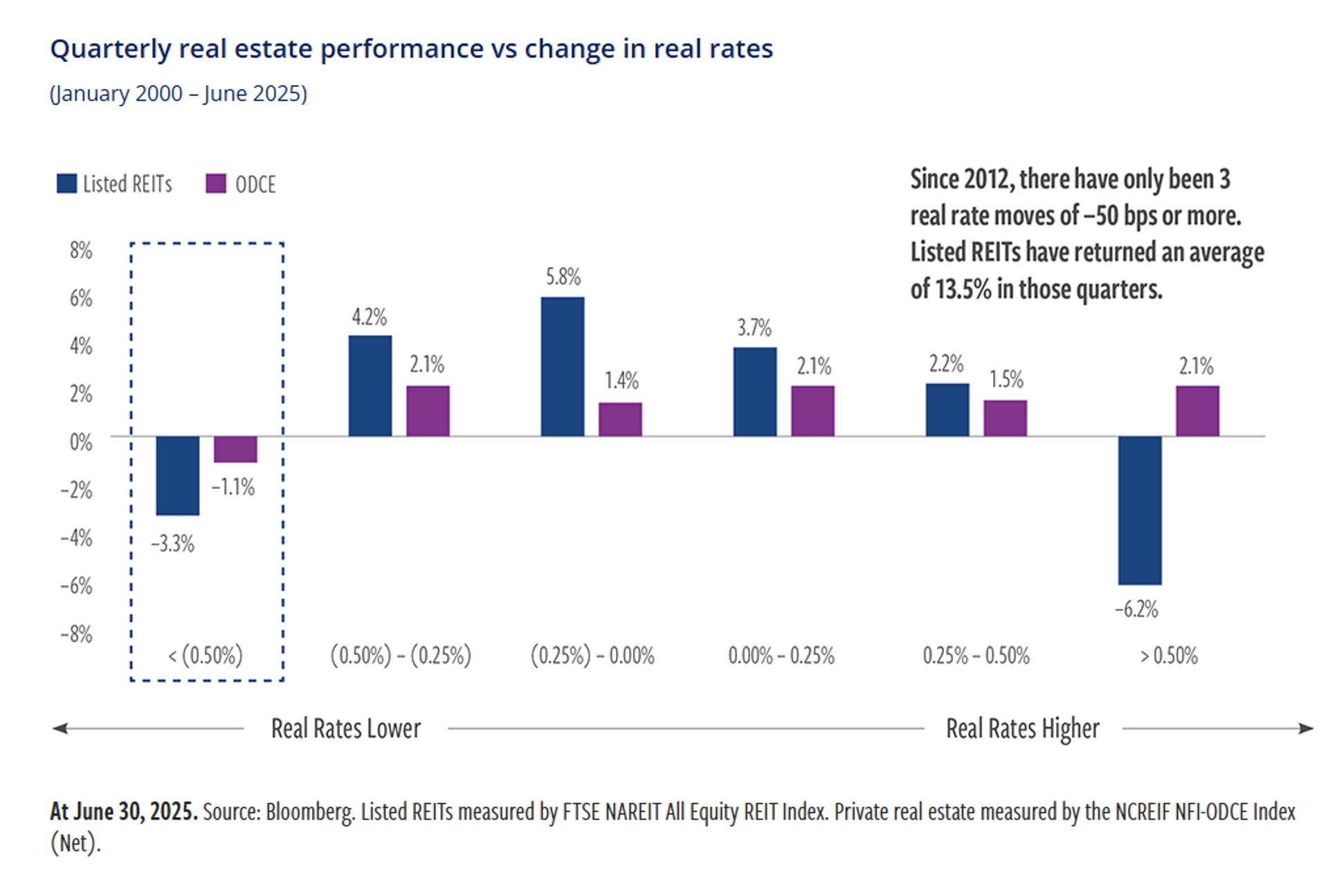 It was that dynamic that drove repricing in both listed and private real estate. Cap rates increased without the offsetting rent growth projections that typically accompany higher inflation expectations.