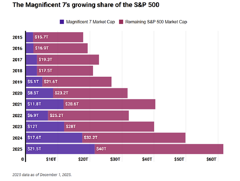 The market capitalization of the Magnificent Seven is nearly $22 trillion and represents 37% to 38% of the S&P 500. If we add in key companies valued heavily on the expansion of artificial intelligence, like AMD (AMD) and Applied Materials (AMAT), it’s another $5 trillion to $6 trillion. We are now up to roughly 50% of the index.