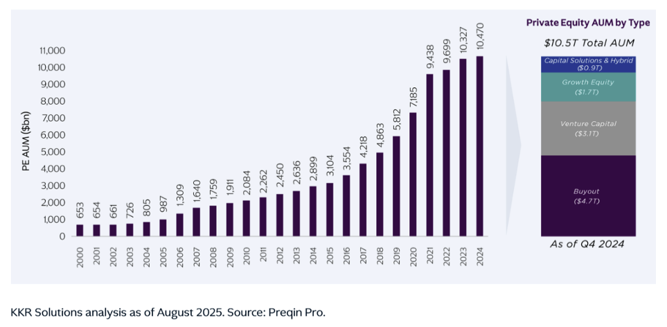 As a direct result, private equity has grown from $653 billion in the year 2000 to over $10 trillion today. For many years now, private firms have generated more capital and job formation than public companies.