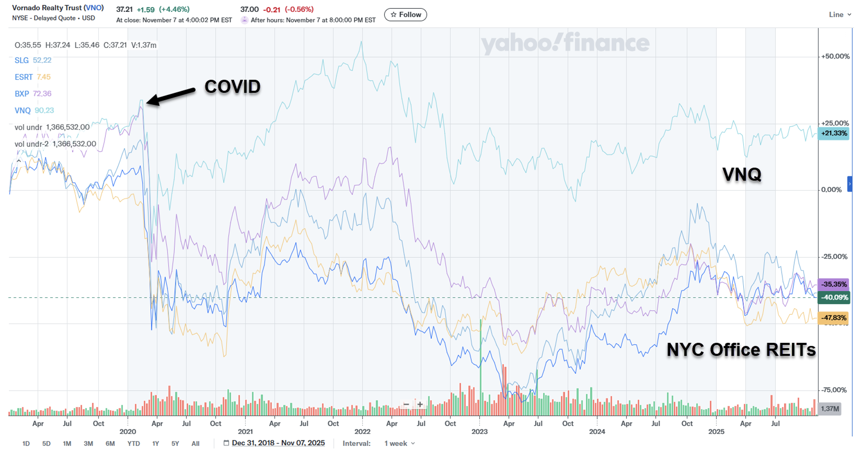 For proof, just look at the Vanguard Real Estate Index Fund (VNQ) compared with just the New York City office REIT space: