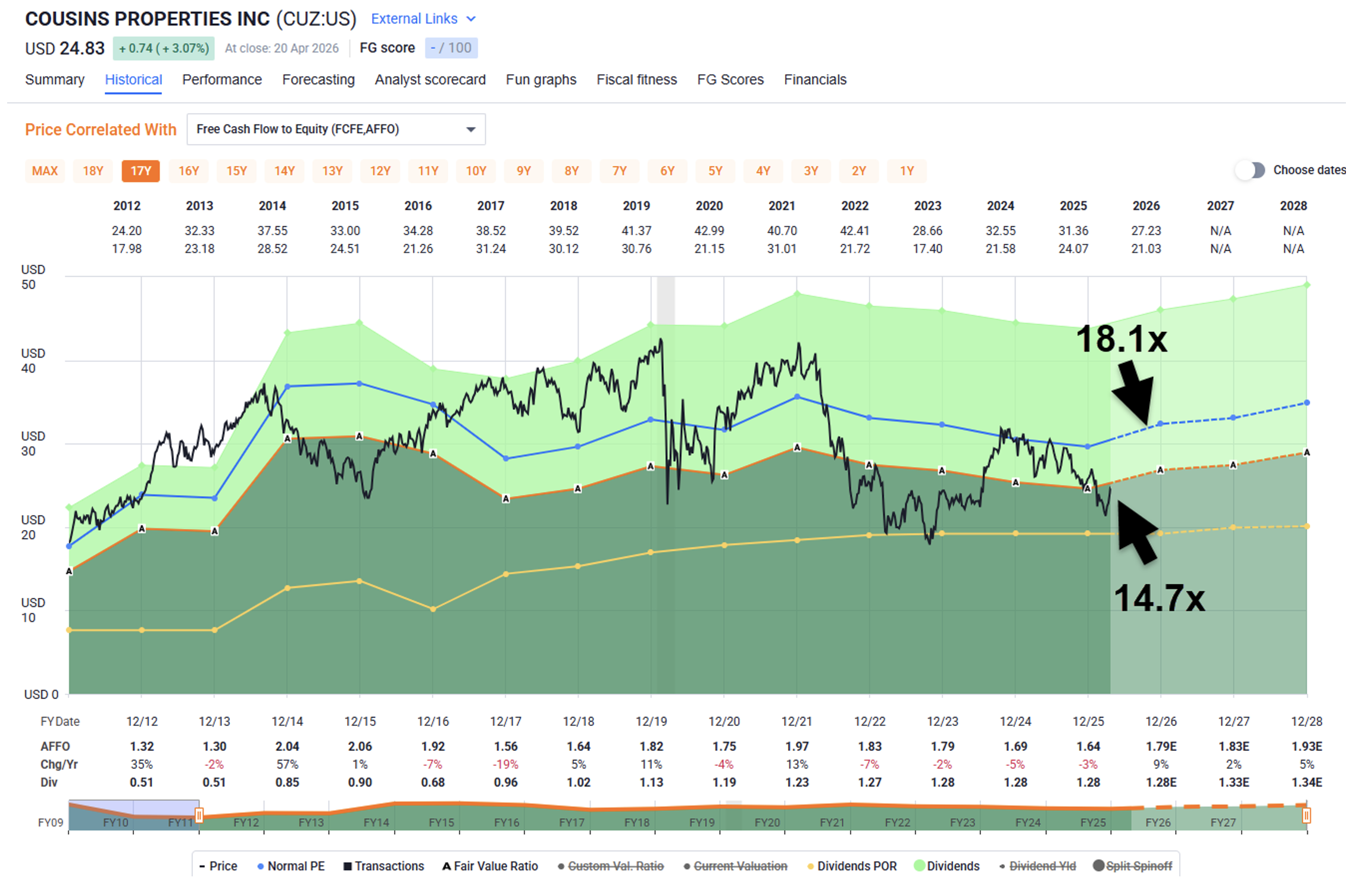 CUZ’s price to adjusted funds from operations (P/AFFO) multiple is 14.7 times. And I believe shares could fetch around $29.90 by the end of the year, even if the company isn’t picked up.