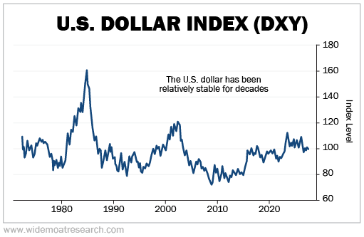 First, the dollar – as measured by the DXY – has been remarkably stable over the decades.