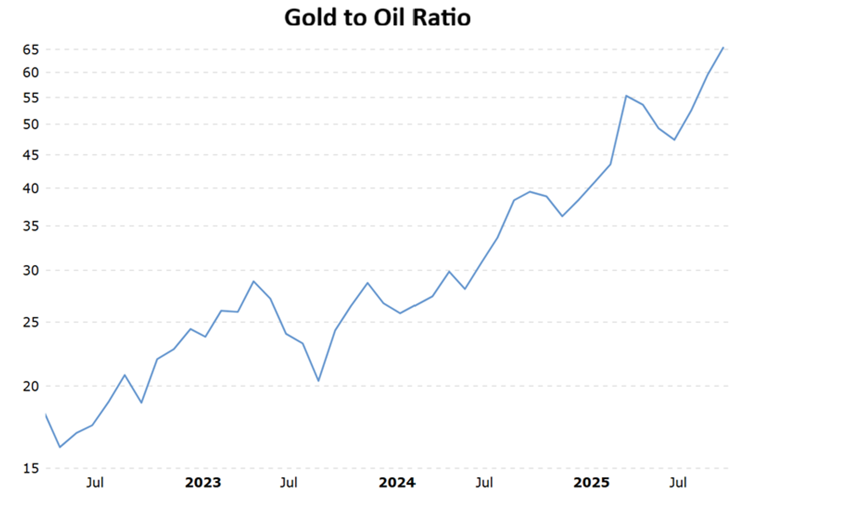 The higher the ratio, the more valuable gold is relative to oil. And as you can see above, gold is almost priced “off the charts.”