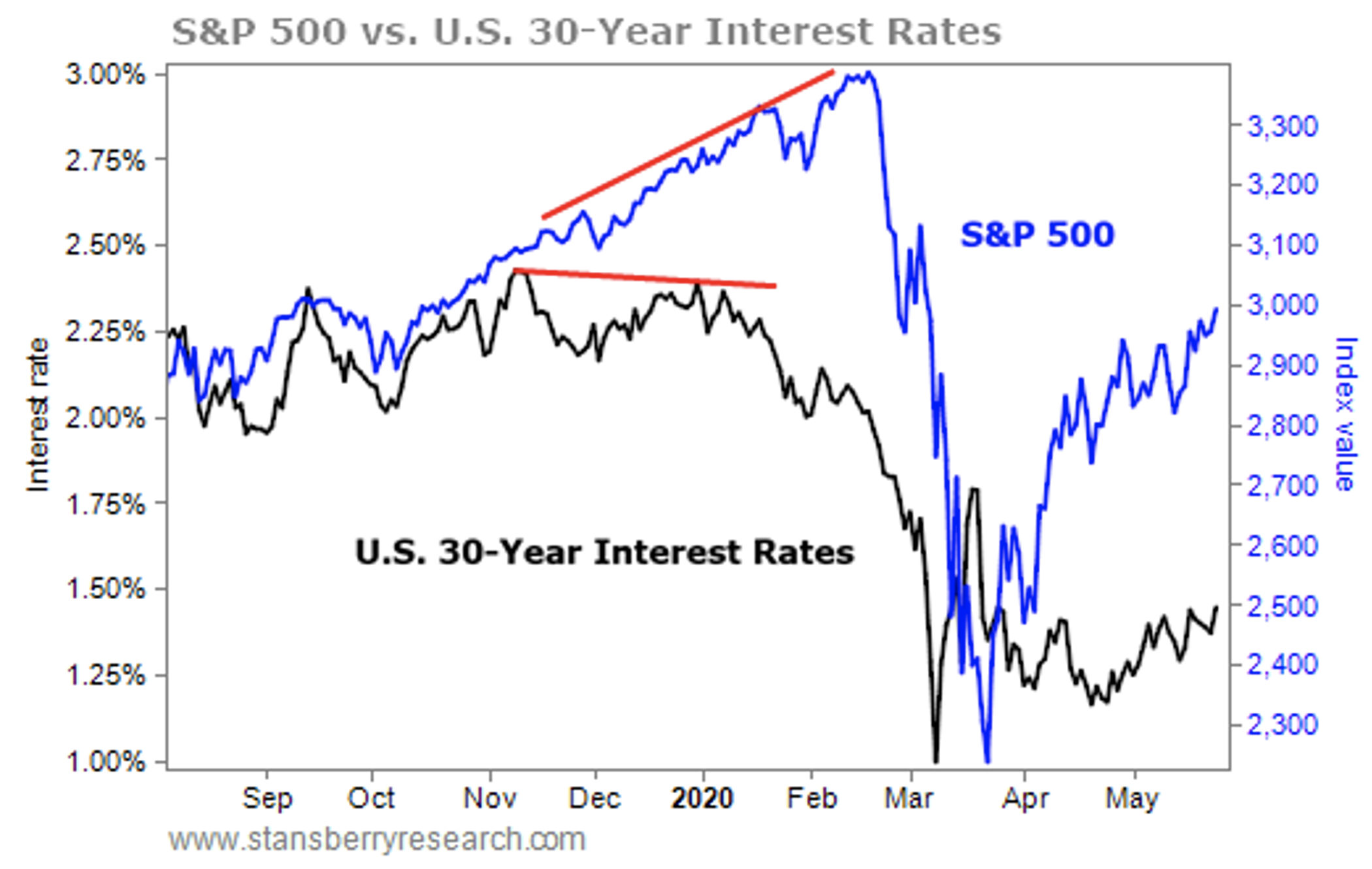 The S&P 500 Index (the blue line) and U.S. 30-year interest rates (the black line) traded in tandem at the end of 2019. The “trade war” with China was calming down, and both asset classes were moving in the same direction. All was well.