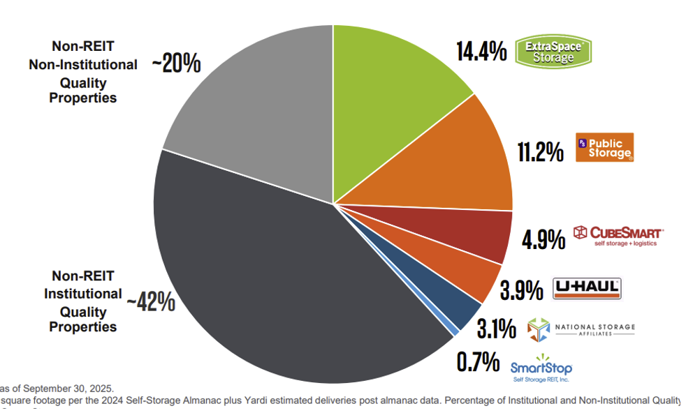 There are around 52,000 self-storage properties in the U.S., representing over 2 billion square feet of rentable space. U-Haul (UHAL) owns 3.9% of that market share, while another 35% is held by REITs.