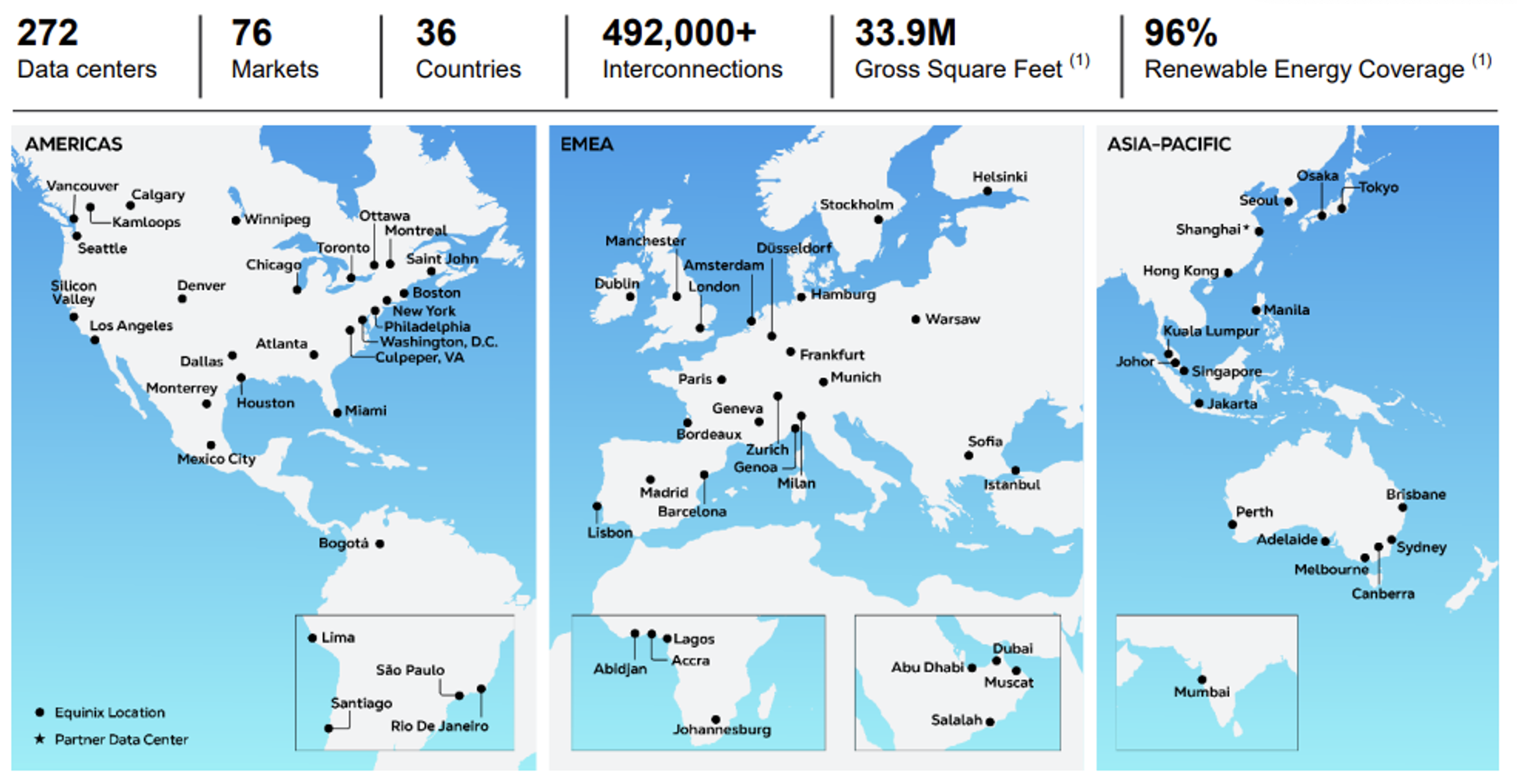 The already mentioned Equinix is one of the largest publicly traded REITS in the world – and a great way to play the AI trend on the infrastructure side. It operates 272 data centers and serves over 10,000 customers across more than 492,000 interconnections located in 36 countries throughout six continents.