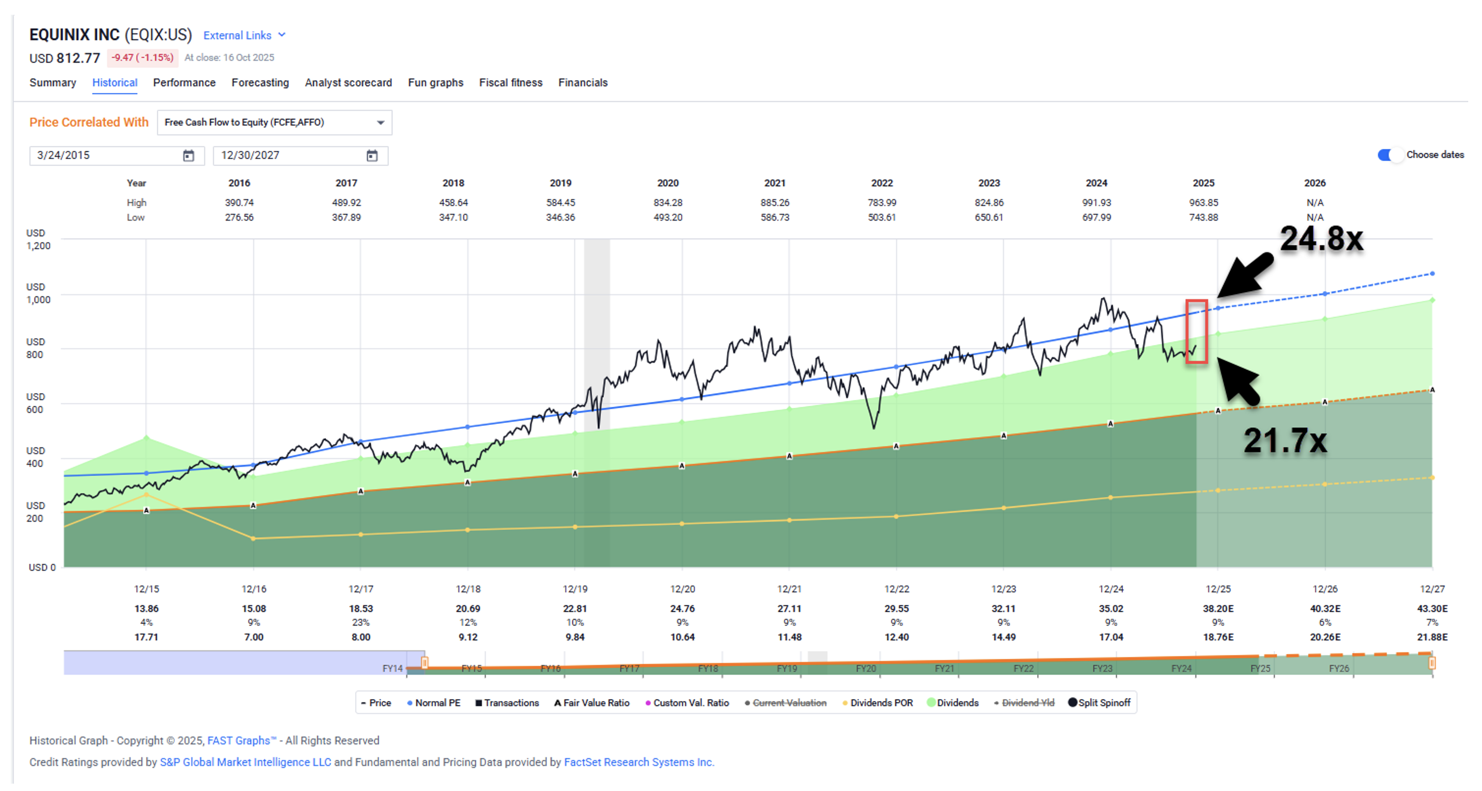 As seen below, shares are now trading at 21.7 p/AFFO compared with its normal 24.8 times multiple. Notably, predict 9% growth this year, 6% in 2026, and 7% in 2029.