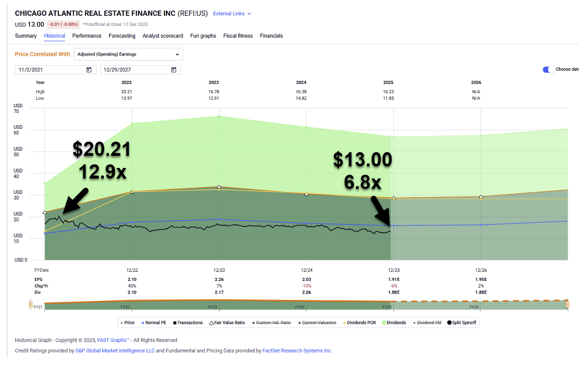 For mortgage REITs, we use the standard stock-evaluation tool of price to earnings (P/E) instead of P/AFFO. As you can see below, REFI traded as high as $20.21 with a P/E of 12.9 times in 2021… and now trades at $13 and 6.8 times, respectively.