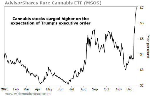 That has caused a lot of problems for real estate investment trusts (“REITs”) that cater to the field. So, I understand why the promise of a more pro-marijuana executive order has caused people to rethink these investments.