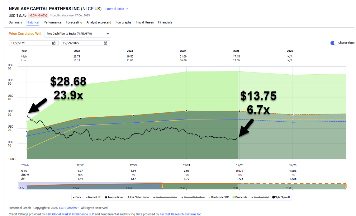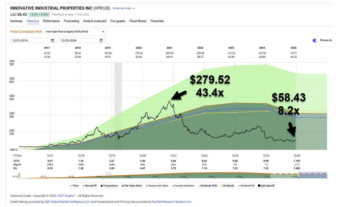 But as the FAST Graphs chart also shows, it didn’t live up to that hype. Shares have since tanked to $58.43, with a price-to-AFFO (P/AFFO) multiple of 8.2 times.