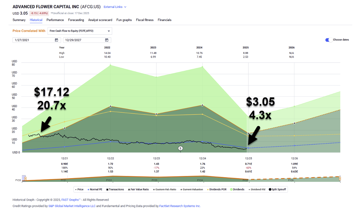 Even worse is Advanced Flower Capital (AFCG), another mREIT based in West Palm Beach. It listed in July 2020 on the Nasdaq and has been a trainwreck ever since as far as performance.