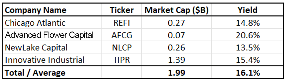 Chicago Atlantic Real Estate Finance (REFI), meanwhile, is a mortgage REIT (“mREIT”) that began trading in December 2021 on the Nasdaq. This means it doesn’t own any physical real estate. Instead, it makes property loans to tenants licensed in their respective states.