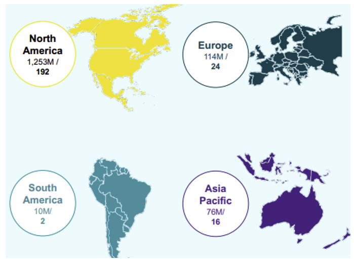 As shown below, Americold owns 237 warehouses with a 20% market share. The company has over 3,000 customers that serve North America, Europe, Asia Pacific, and South America.