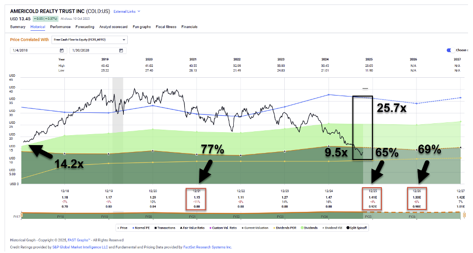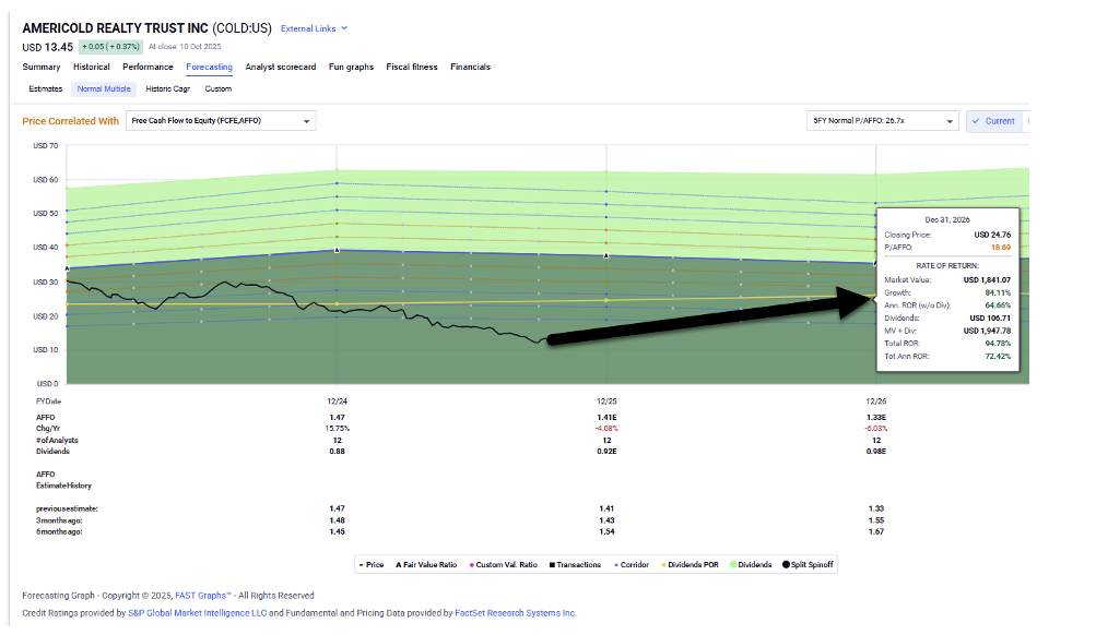 Moreover, shares of Americold are now trading at 9.5 times adjusted funds from operations (“AFFO”) compared with the normal (historical) valuation of 25.7 times. And that deserves consideration even though growth expectations are negative for the year… and negative for 2026 as well. Analysts don’t get more bullish until 2027, where consensus growth goes back to a safer 7%.