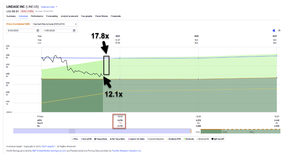 Lineage is cheap as well, though it’s trading a bit higher than Americold at 12.1 times. Its dividend yield is 5.7% with a payout ratio of 65%, and analysts expect negative 1% growth this year and flat growth in 2026.