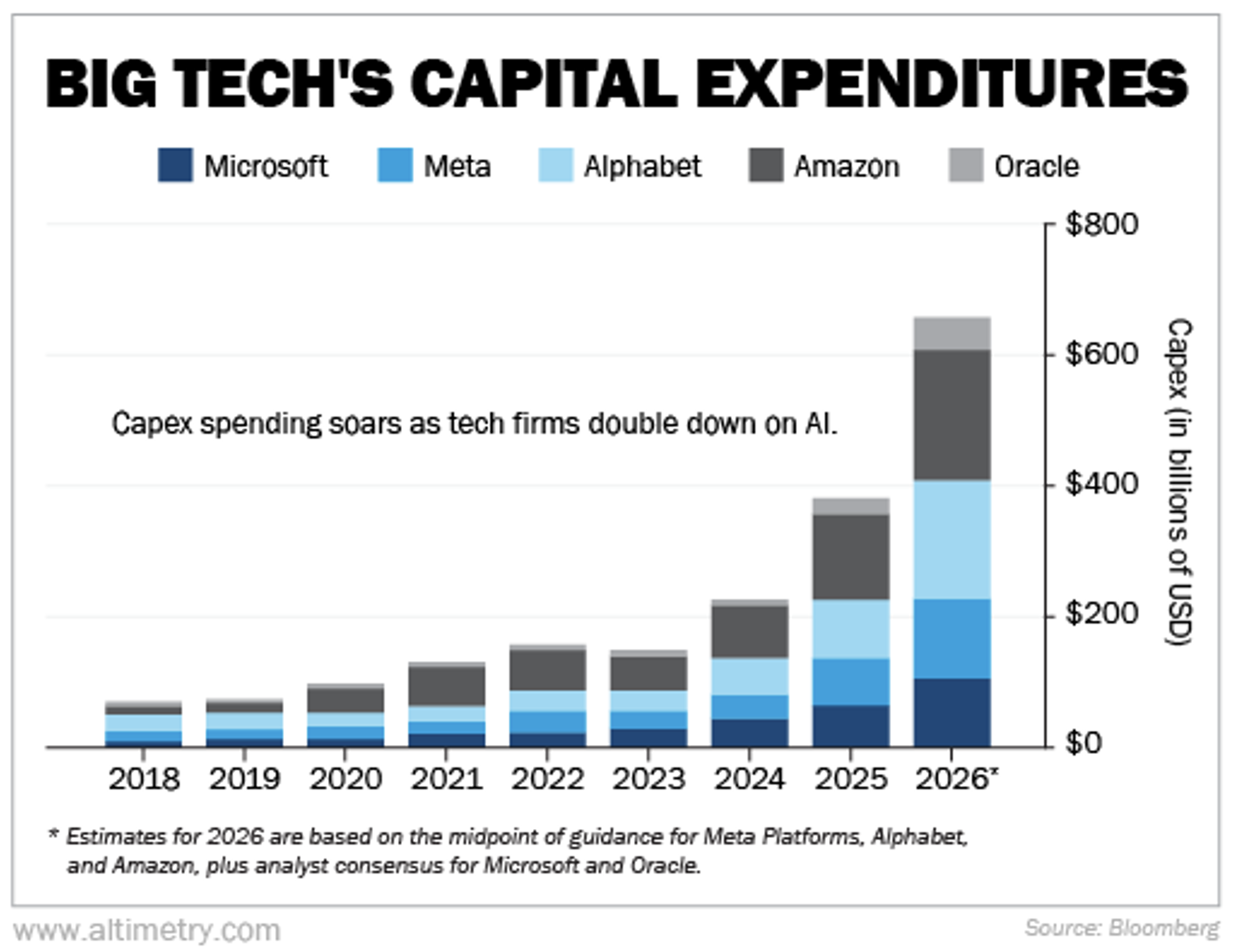 The five biggest U.S. tech companies are forecast to spend about $650 billion in capex in 2026, based on company guidance and consensus estimates.