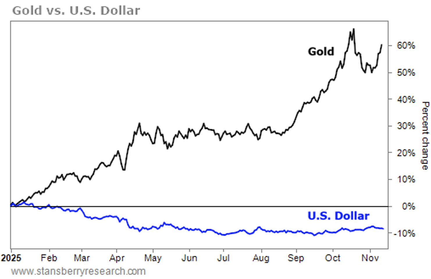 This year alone, gold prices have outperformed the U.S. dollar by more than 60 percentage points. Take a look…